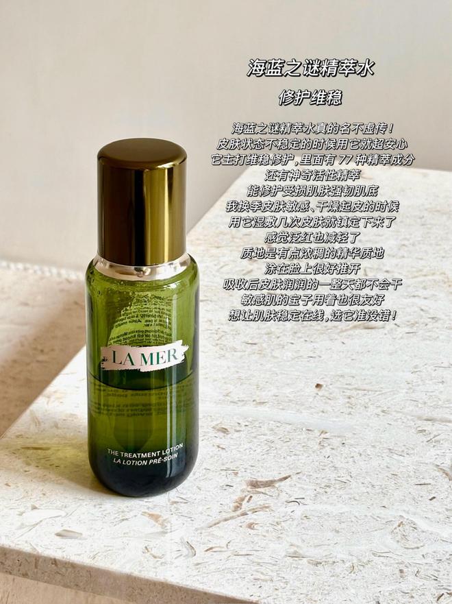 海蓝之谜精萃水真的名不虚传,皮肤状态不稳定的时候用它就招安心,它主打维稳修护,里面有77种精萃成分,还有神寄活性精萃,能修护受损肌肤强初肌底,我换季皮肤敏感、干燥起皮的时候用它远敷几次皮肤就镇定下来了感觉泛红也减轻了。