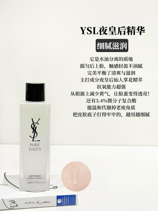 我喜欢以油养肤,平时熬夜比较多,这瓶精华水真的拯救了我。它不仅能舒缓保湿,还能提亮肤色,搭配上YSL夜皇后精华,效果更是绝了。