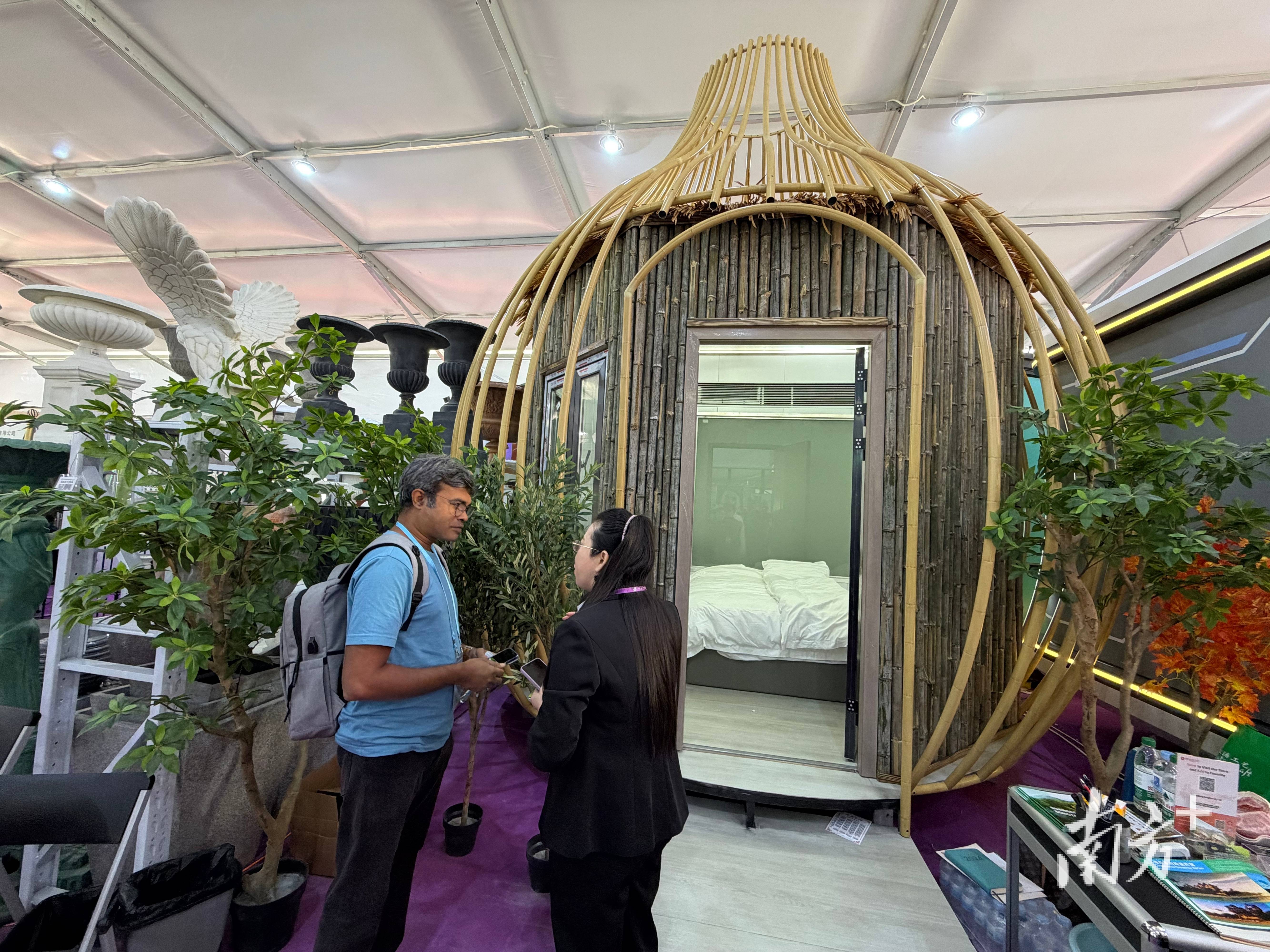 松涛展位负责人梁松告诉记者,该产品外观使用铝材仿竹、真竹等环保材料制作,墙壁则用碳化硅浇筑:既无甲醛释放,又能保证强度与搭建效率,“产品规格还特意优化,更便于运输与拼装,适用于景区、海边等场景,对环境的破坏极小。”