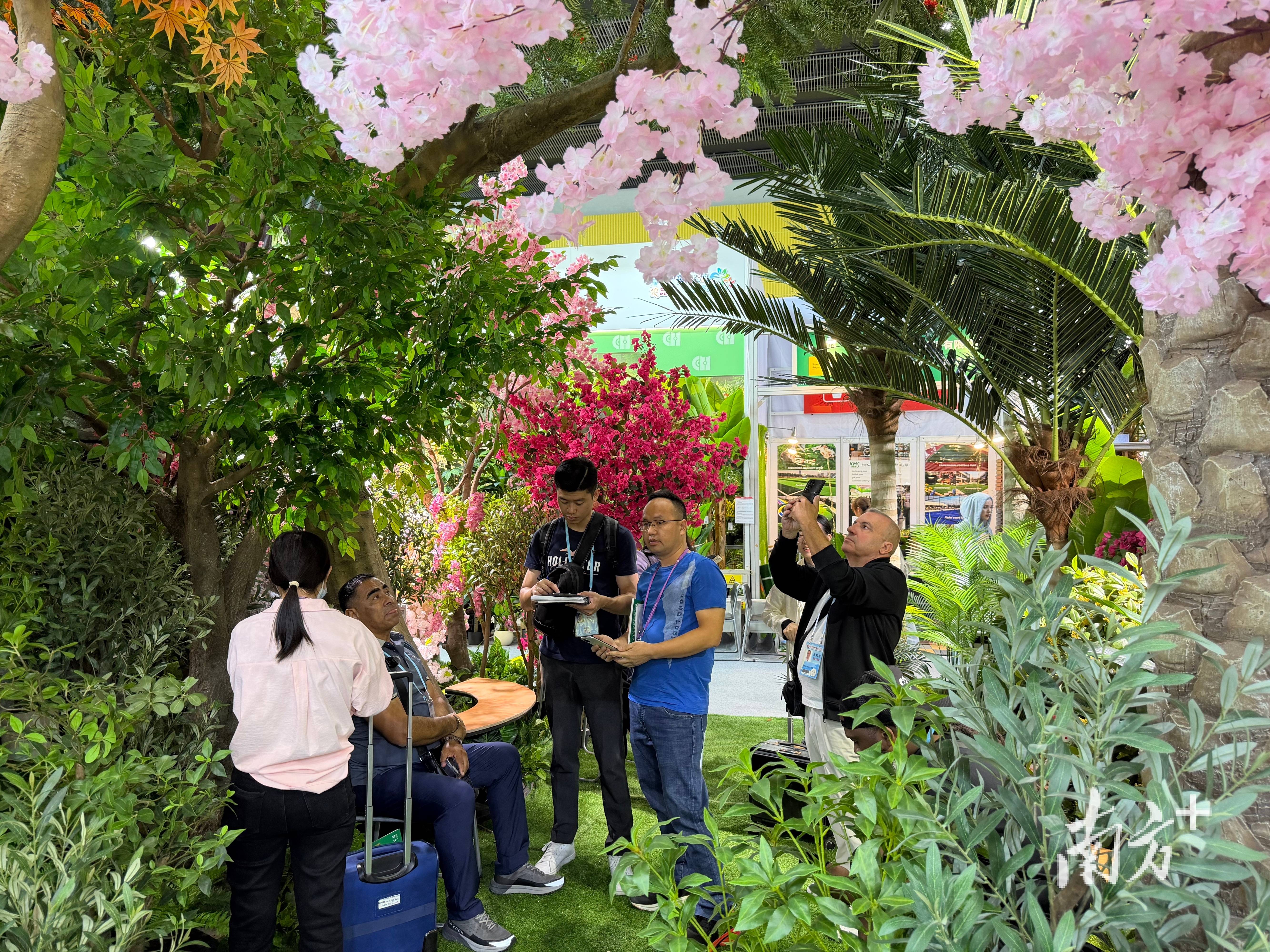 在展馆A区,松涛还带来了公司的另一条产品线米高的凤凰树前围满了好奇的客商。梁松笑着比喻:“这款产品的制作过程就像‘炒菜加调味料’,树干用硅酸镁与其他成分混合制成,兼顾环保、防火、凝固快、硬度高的优势,特别受共建‘一带一路’国家和地区的客商青睐。”
