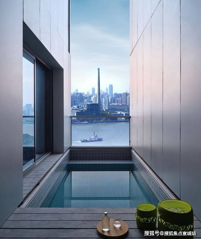 约252㎡中间套则在13.2米瞰江面基础上,奇数层开创性地增加了约6米的进深采光面,利用中间套的双层挑高,打造上海滨江首个空中泳池户型